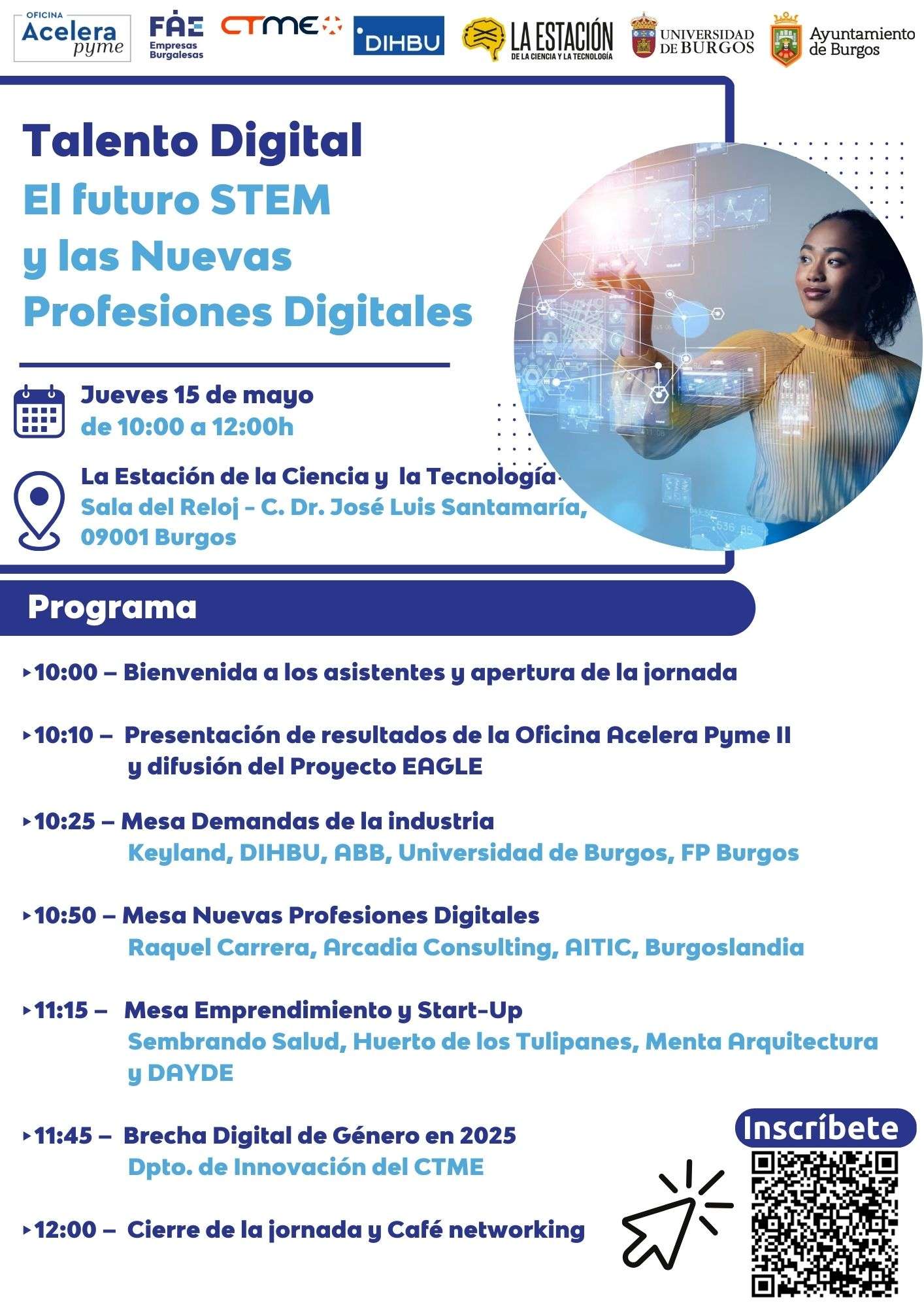 Nuestro socio FAE Burgos organiza la jornada de Talento Digital, El Futuro STEM y las Nuevas Profesiones Digitales. Donde se desarrollarán unas sesiones dedicadas al impulso del talento digital y a las nuevas oportunidades profesionales en el ámbito de las TIC y las disciplinas STEM, con especial foco en jóvenes profesionales, mujeres y emprendedores del entorno rural.